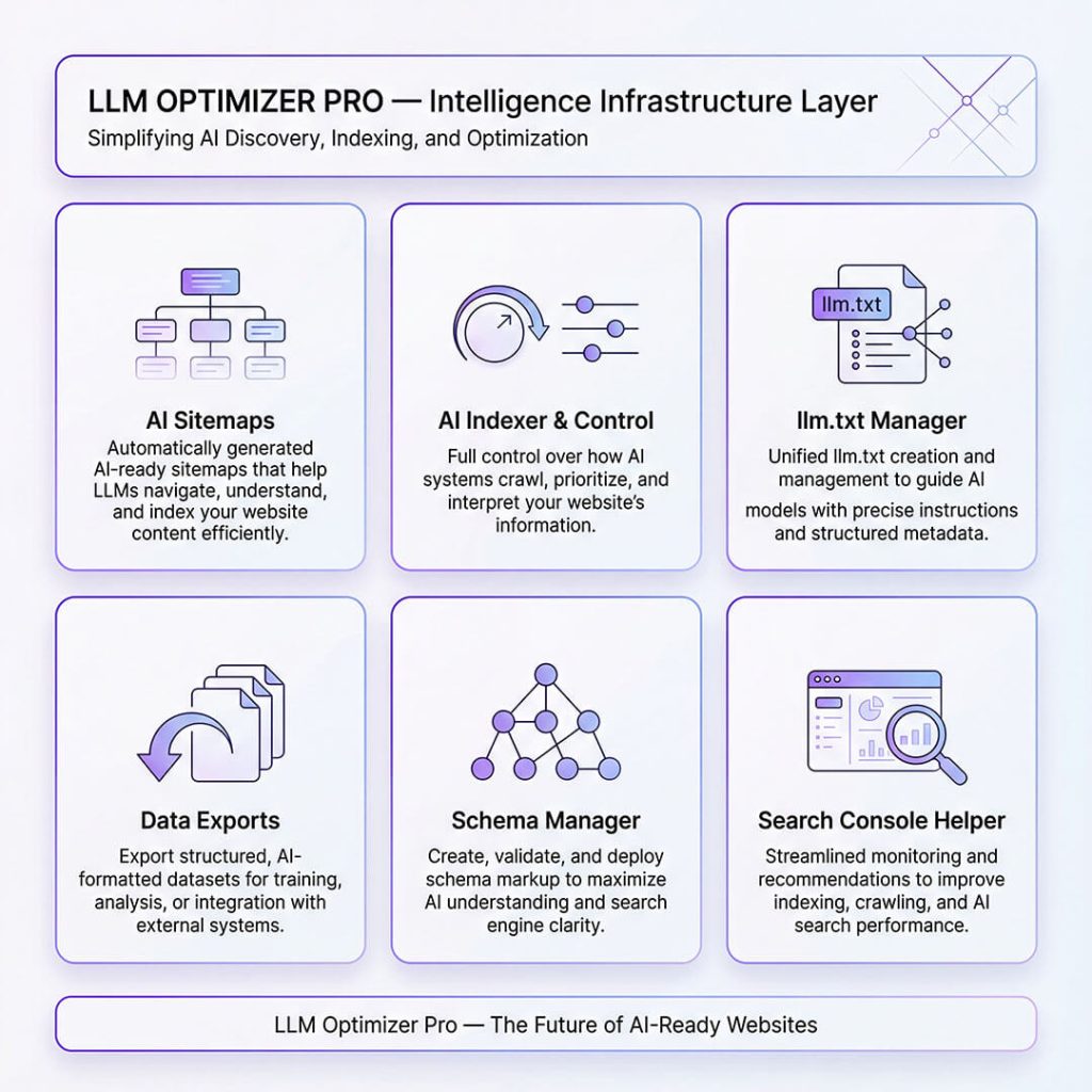 Most SEO plugins stop at Google. LLM Optimizer picks up where they leave off, providing the 6 critical infrastructure layers required to rank in ChatGPT, Claude, Perplexity, and Gemini.