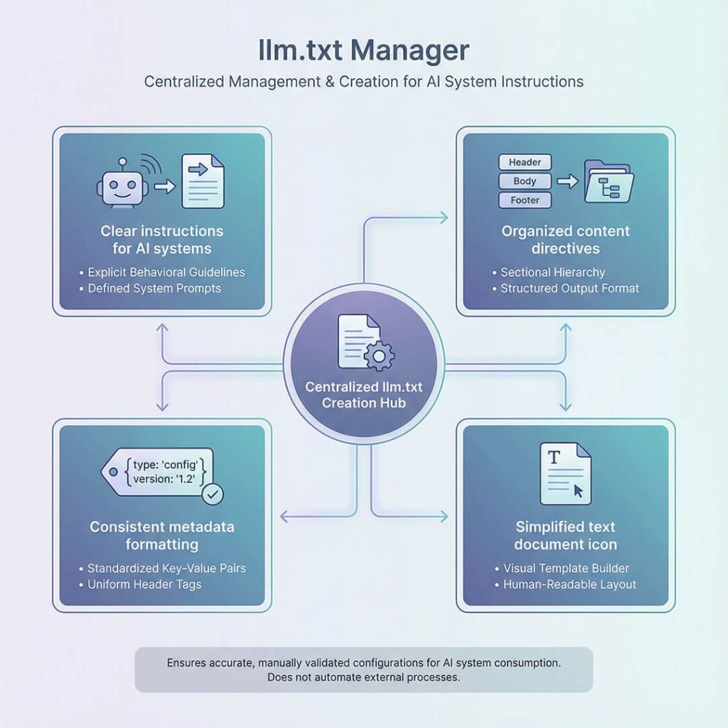 The llm.txt Manager gives you a simple text area to inject “Global Context” into every AI interaction.