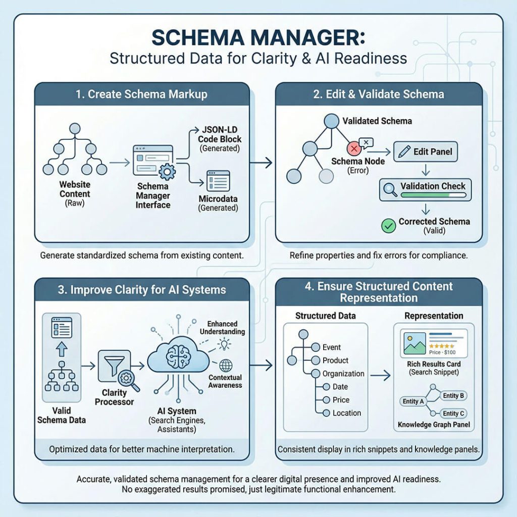 If we detect that Yoast or RankMath is already outputting basic schema, we don’t duplicate it. Instead, we enhance it by adding the AI-specific fields they miss (like `mentions`, `citations`, and `significantLink`) to creating a richer Knowledge Graph.